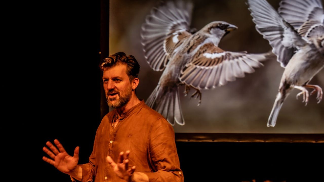‘Het is altijd een beetje droevig als je voor de start moet zeggen: ‘djuu, we gaan nooit tijd genoeg hebben’, maar dat is nu eenmaal zo als je Begijn Le Bleu inviteert om te komen praten over vogels.’ Linde MerckpoelSchrik niet! De nieuwe voorstelling van Begijn Le Bleu gaat over de huismus, het kleine vogeltje draagt immers een ongelofelijke geschiedenis met zich mee. Zodra de landbouw verscheen in het Midden-Oosten, pikte deze rakker letterlijk een graantje mee en verspreidde zich zo over de wereld. De onmetelijke tocht die Tjilp achter de rug heeft, is voer voor een spannende pageturner.Beleef de opkomst en ondergang van de underdog van onze natuur tegen de achtergrond van een brok vaderlandse geschiedenis, een reis naar het China van Mao en een bezoek aan de Afrikaanse steppen.Blij met een dode mus is humor, geschiedenis en wetenschap, verenigd in een avontuurlijke theatervertelling. Folkduo Naragonia begeleidt Begijn Le Bleu met eigenzinnige folk en een verfijnde, stevige energie. In 2024 won dit duo de award voor beste liveband tijdens Flanders Folk Awards. Begijn Le Bleu heeft sinds 2017 zijn eigen podcast Fwiet! Fwiet! over vogels in de Lage Landen en is medeoprichter van het vogelblad Fwiet, een van de mooiste natuurbladen in onze regio. Zijn eerste natuurvoorstelling Kijk! werd enthousiast onthaald en hij is als wetenschapper wekelijks te gast in het Radio 2-programma de Weekwatcher.Artikel: Begijn Le Bleu luidt de alarmbel